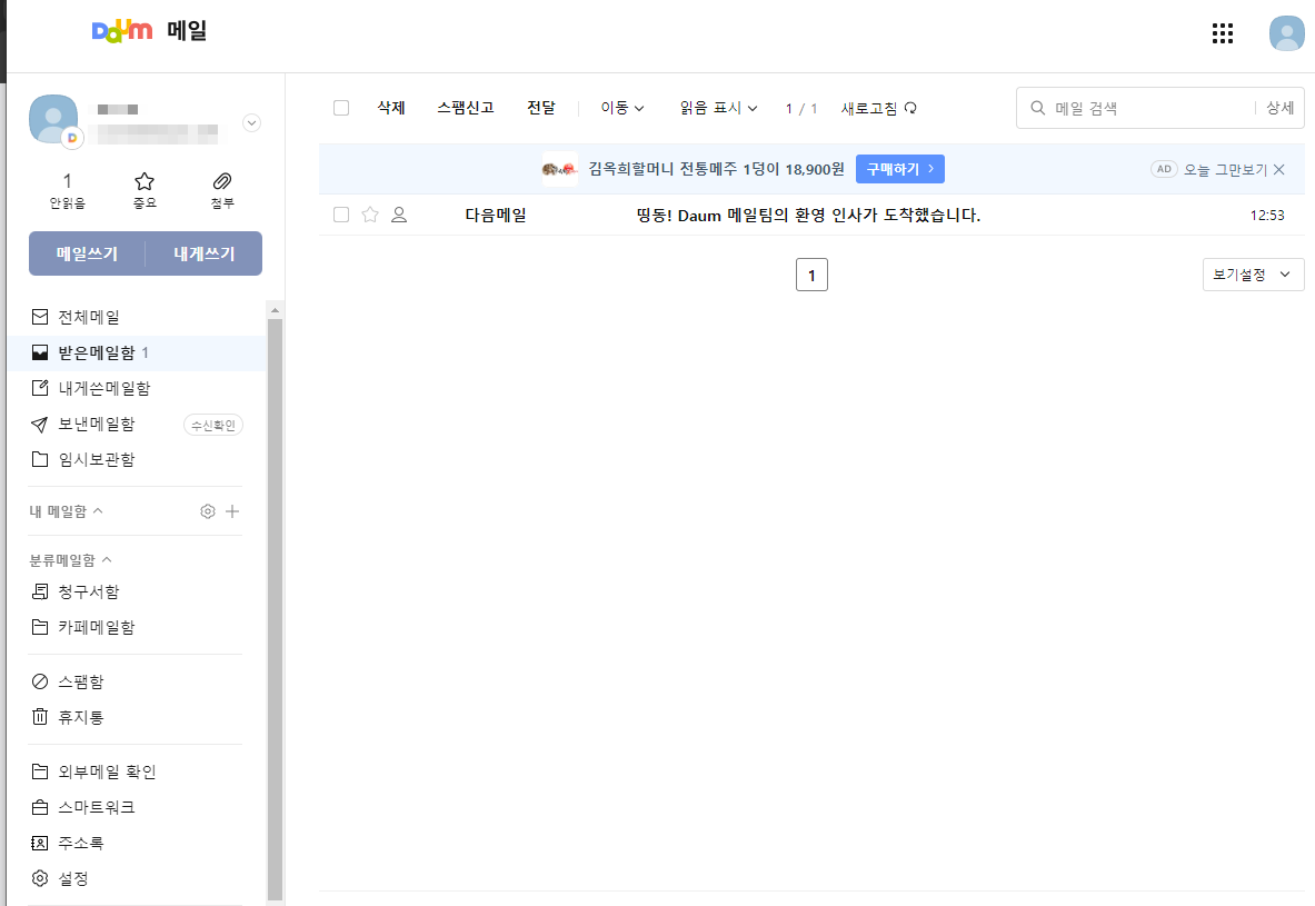 면이 나와요. 이 서비스를 이용하실 때 가장 유의하셔야 되는 부분은 받은메일함이겠져. 저의 경우 방금 아이디를 만들어서 이메일이 쌓여있지 않은데, 이멜을 오랫동안 사용하신 분들은 업무라던가 인증, 홍보 등등 다양한 메일이 도착해있을 것입니다. 꼭 확인을 해주시면 좋아요. 클릭하는 순간 상대방에게는 수신확인이 된 것으로 나타나기 때문에 읽기 곤란한 이멜은 읽지 말아버리는 것도 방법이죠