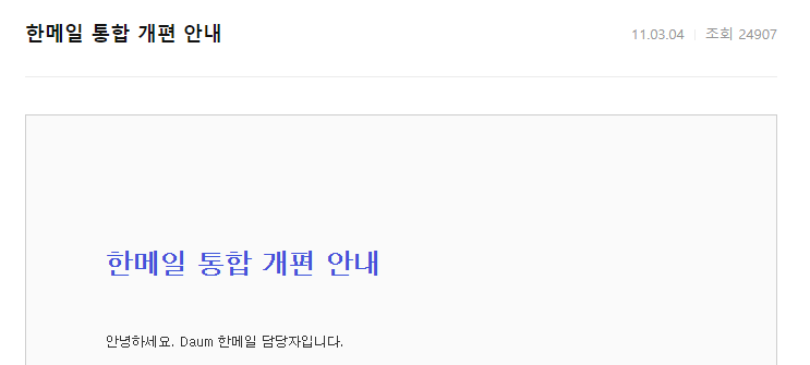 한메일 바로가기 www.hanmail.net 2011년에 명칭이 유지되다가 변경되었다고 하네요. 여기에 보시면 한메일 통합 개편이라는 안내사항이 있죠? 그리고 위 문서를 자세히 읽어보시면 옛날에 카카오랑 합쳐지기 전에 다음을 이용하셨던 분들은 메일주소를 한멜로 선택할 수 있었다고 하는데요. 그러나 이제는 불가능하다고합니다. 즉, 오래전에 아이디를 만드셨던 분들은 별다른 불편사항없이 그래도 한메일을 사용이 가능하다는 뜻이지요!
