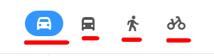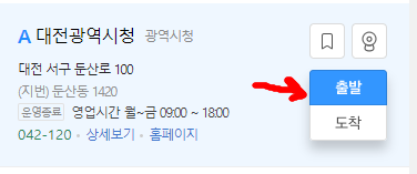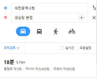다음지도 검색의 매우 인상적인 기능 중 하나는 바로 길찾기죠. 만약 본인이 원하는 목적지를 "도착"지로 설정하고 싶다면 위 사진처럼 세팅을 한 뒤, 출발지를 입력합니다. 입력하거나 다음지도 검색 후 "출발"로 세팅하셔도 됩니다. 그러면 이제 자가용 차 기준으로 이동 경로와 시간을 안내를 해주죠. 제일 처음게 차, 대중교통, 사람(도보), 자전거 순으로 경로와 소요시간을 알려줍니다. 정말 최고의 기능이에요.