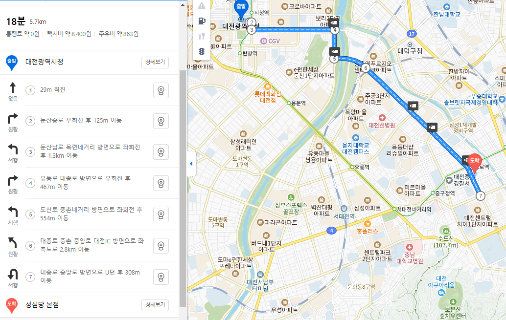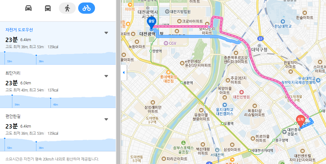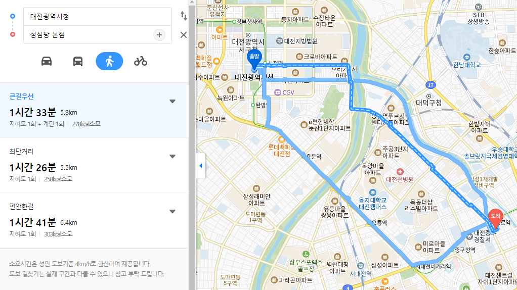다음지도 검색 에서는 앞서 말씀드린대로 걸어서, 그리고 자전거 등으로 소요시간을 확인도 가능한데요. 놀라운건 자전거로 갈 시 23분으로 지하철이랑 똑같은 시간이 걸린다는 겁니다. 역시 대전이 자전거 길자체는 잘되어있어요. 근데 여기서 드는 생각이 하나있죠. 아니 사람마다 자전거나 걷는 속도가 다를텐데 어떻게 측정한거지? 하실 수 있는데요. 밑에 보시면 걷는건 성인 도보기준 4km/h, 자전거는 평균속도 20km/h 로 환산하여 측정했다고 합니다. 즉, 걸음이 빠르거나 자전거를 더 빨리타면 시간을 단축시킬 수 있다는 게 재미난점이죠.