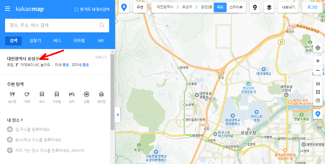 링크를 이용하여 접속해보셨나요? 그러면 일단 위와같은 사이트 모습이 보이실 것입니다. 제일 첫번째로 설명드릴 내용은 검색창 아래에 보이는 위치정보인데요. 자신이 접속한 IP 주소를 기반으로 위치를 확인하실 수 있어요. 저는 대전광역시 유성구로 나오는군요. 정확하네요. 그리고 여러분들이 검색하고자 하는 장소를 이제 찾아보시면 될 것입니다. 이제 여러분들께 설명을 드리기 위해 한번 예시를 들어볼 예정인데요.