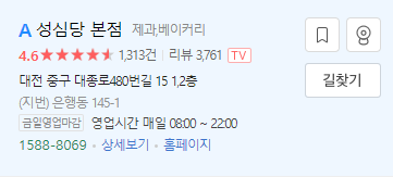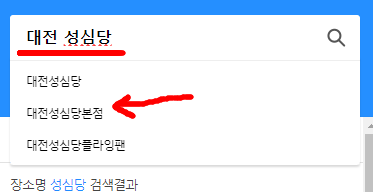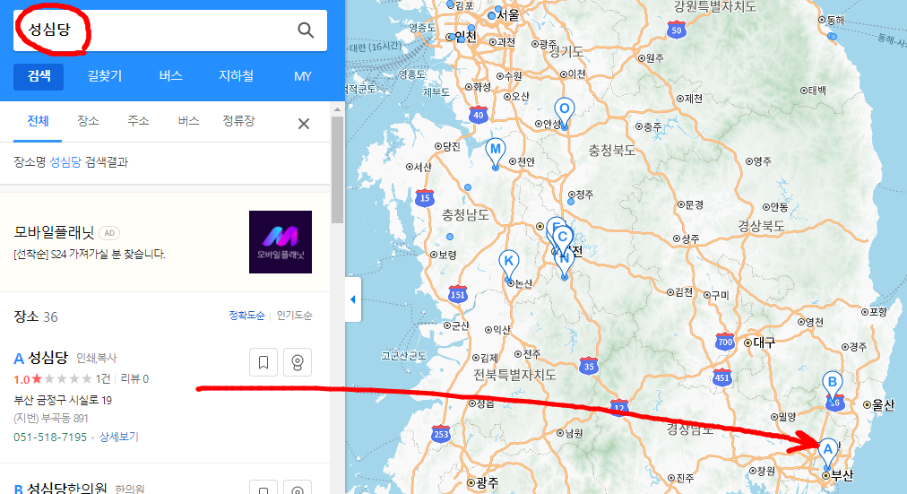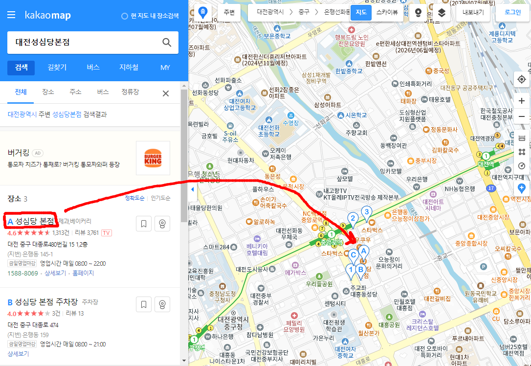 다음지도 검색 기능을 이용하시려면 "장소, 주소, 버스 검색" 이라는 글자가 적혀진 칸에다가 장소를 입력해보시는 것입니다. 예를 들어보기 위해서 성심당이라고 쳐보았습니다. 대전의 명물 빵집인 성심당의 경우 전국적으로 체인점이 있어서 우리나라 전체 지도가 뜨죠? 장소 아래에 알파벳으로 지정된 마킹이 지도상에 떠서 어디가 어디인지 확인하기가 매우 쉬워요. 하지만 만약 구체적인 위치를 정해주시면 더 자세한 결과가 나와요. 대전 성심당이라고 치는 순간 본점의 위치가 확인이 되는 모습을 볼 수있죠.