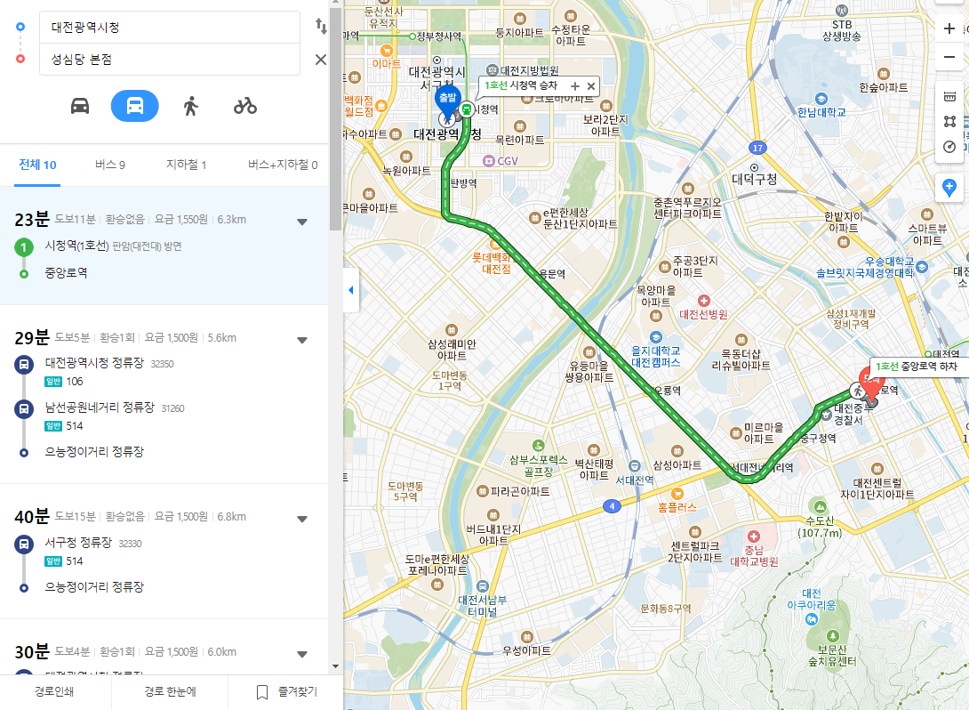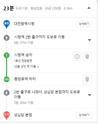 다음지도 검색 에서는 버스가 빠른지 지하철이 빠른지도 한눈에 볼 수 있어요. 지금 보이는건 지하철 노선이 최적의 노선에, 최고로 단축되는 소요시간을 갖고 있는 것으로 보이는데요. 더 자세한 걸 확인하고 싶다면 옆에 보시면 ▼ 라는 버튼이 있어요. 이걸 클릭하는 순간, 어느정도까지 도보로 이동 하고 지하철을 탑승해야되는가, 어느 역에서 하차한 뒤 몇번 출구로 나와서 목적지까지 걸어서 가야되는가를 전부 친절히 알려줘요. 짱이죠.