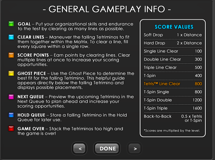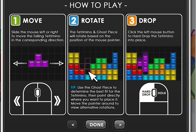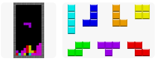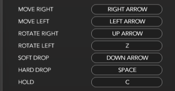 - 조작키 : 키보드 방향키 ←, → 을 이용하여 블럭을 이동시킬 수 있고, ↑을 이용하여 오른쪽으로 회전시킬 수 있다. ↓ 키를 이용하여 블럭을 빨리 내릴 수 있다.
