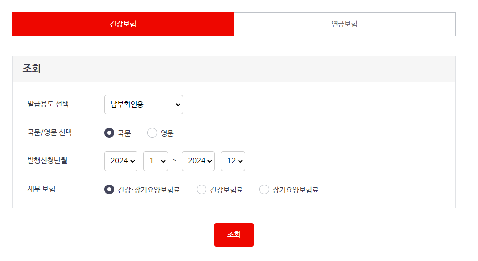 인증이 되셨다면 건강보험료 납부확인서 인터넷발급 홈페이지에 다시 돌아가지게 되는데요. 다시한번 클릭을 해서 열어주고요. 그러면 이제 "조회" 기능이 활성화됩니다. 여기서 발행 신청년월 등을 세팅하시고 국문/영문도 선택하시고요. 발급용도도 본인의 필요에 맞게 선택을 하신 다음 "조회"를 눌러주세요. 그 후 결과에서 출력버튼을 눌러보실까요?