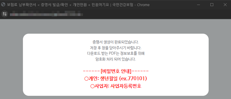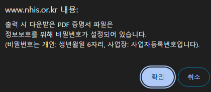 건강보험료 납부확인서 인터넷발급 출력을 클릭하시면 PDF 증명서 파일이 생성이 됩니다. 정보 보호를 위해 비번이 설정되어 있다는 군요. 어렵게 되어있진 않지만 우리만 알아볼 수 있도록 생년월일 6자리로 세팅되어있습니다. 예를 들자면 680301 이라고 치면 된다는 것이죠. 사업장이신 분들은 사업자등록번호 쓰시면 열리고요. 자 파일을 따운받고 열어볼까요? 정상적으로 열리는 모습이 보이네요