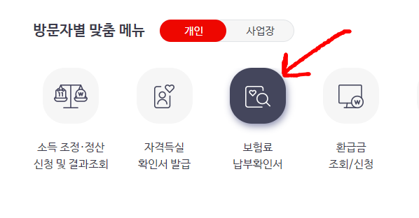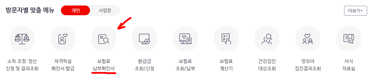 홈페이지에 들어오시면 위와같은 화면이 뜨게 됩니다. 여기서부터가 중요해요. 정말 어렵지 않습니다. 하단에 보시면 건강보험료 납부확인서 인터넷발급을 위한 방문자별 맞춤 메뉴에 세번째에 위치하고 있는 저것을 클릭해줍니다! 요즘 사이트가 정말 잘 만들어진 것 같아요. 빅데이터라던가 이용 수에 따라 많이 이용하는 것들은 저렇게 잘보이게 되어있거든요.