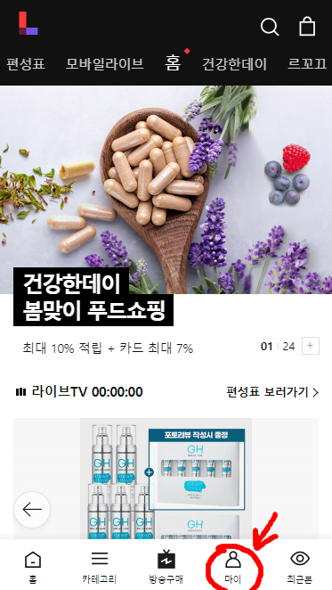 세번째로 해볼 수 있는 롯데택배 실시간배송조회 방법은 개인적으로 더 편리하게 이용한 것인데요. 자신이 물건을 시킨 어플이나 오픈마켓에 들어가보세요. 저는 예시를 들어보기위해 롯데홈쇼핑에서 구매한 것을 볼건데요. 로그인 후 대부분 "마이", "My page" 등으로 표현되는 곳에 들어가신 뒤, 주문 조회라는 란이 대부분의 사이트나 어플에 존재할 것입니다. 거기서 배송조회를 눌러보면 현재 어디까지 물품이 왔는지 확인이 가능하지요.